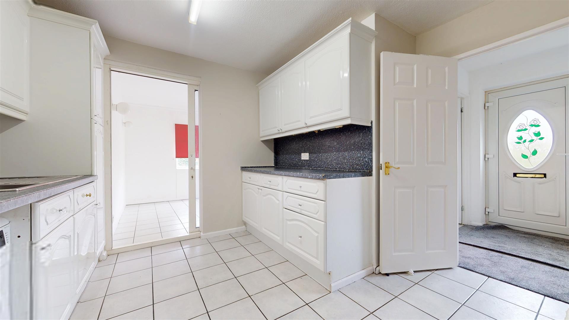 Fitted wall and base units with worksurfaces incorporating sink drainer. Electric oven and hob with extractor over. Integral fridge. Plumbing for washing machine. Understairs storage cupboard. Radiator. Double glazed patio door to rear.