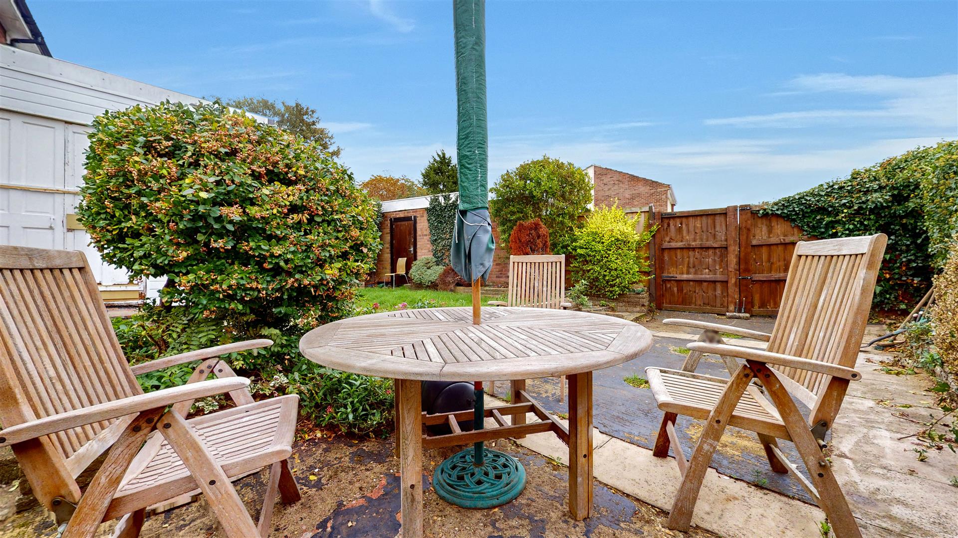 Paved patio and hardstanding. Lawn area with raised beds. Double gates to rear. Personal door to garage.