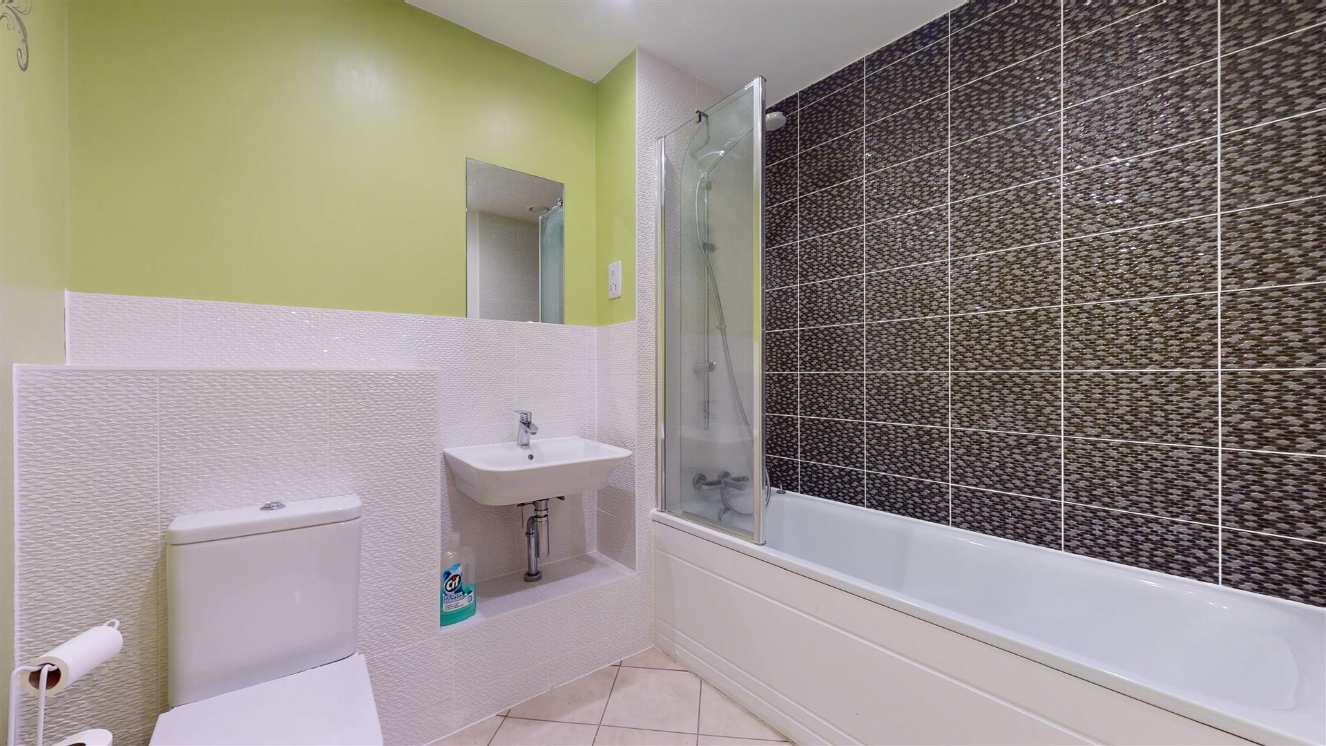 Three piece suite comprising panelled bath with mixer tap and shower attachment, low level wc and wash hand basin. Part tiled walls. Shaver point Extractor. Skimmed ceiling with inset lighting. Wall mounted heater.