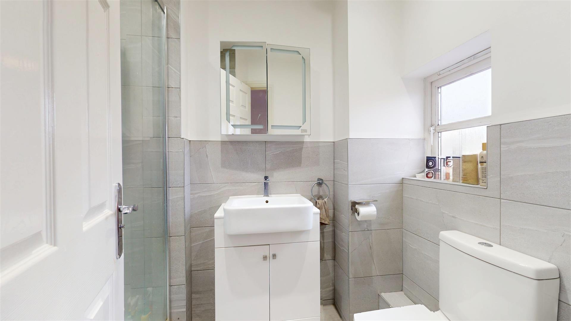 Three piece suite comprising panelled bath with shower over, low level wc and wash hand basin. Part tiled walls. Tiled flooring Shaver point. Extractor. Skimmed ceiling Radiator. Tiled flooring.