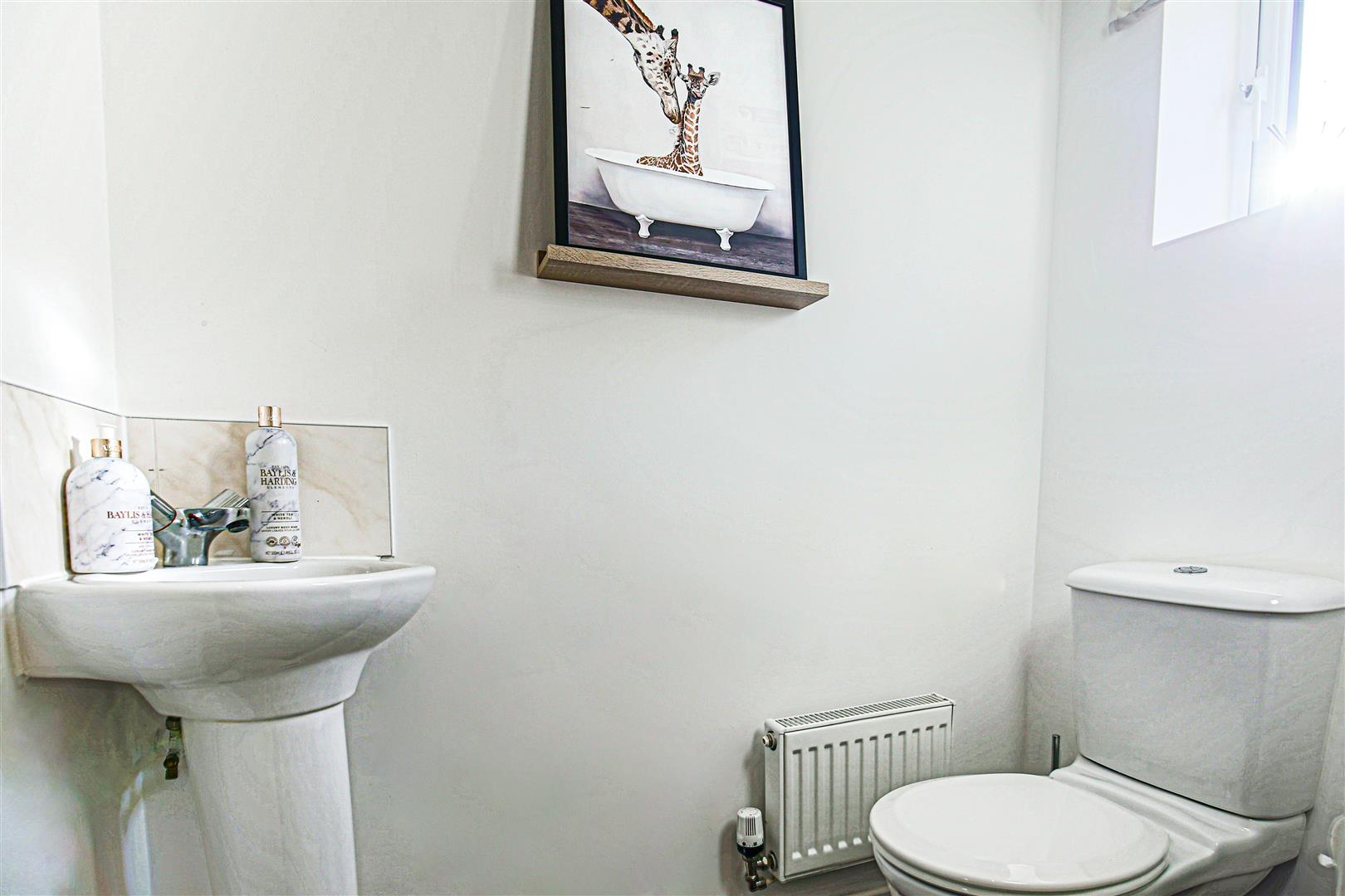 Two piece suite comprising low level wc and wash hand basin. Splash back tiling. Radiator. Skimmed ceiling with inset lighting.