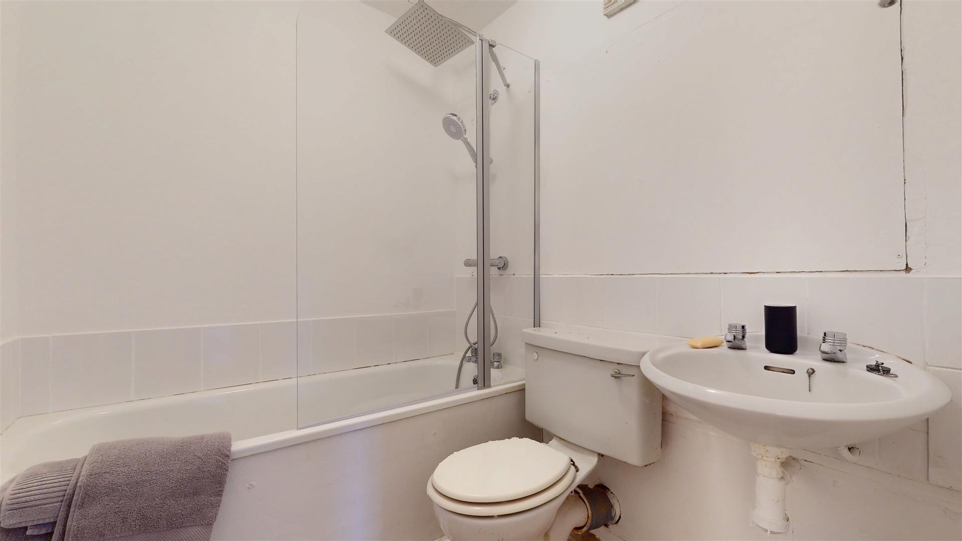 Three piece suite comprising bath with mixer tap and shower with screen, close coupled wc and wash hand basin.