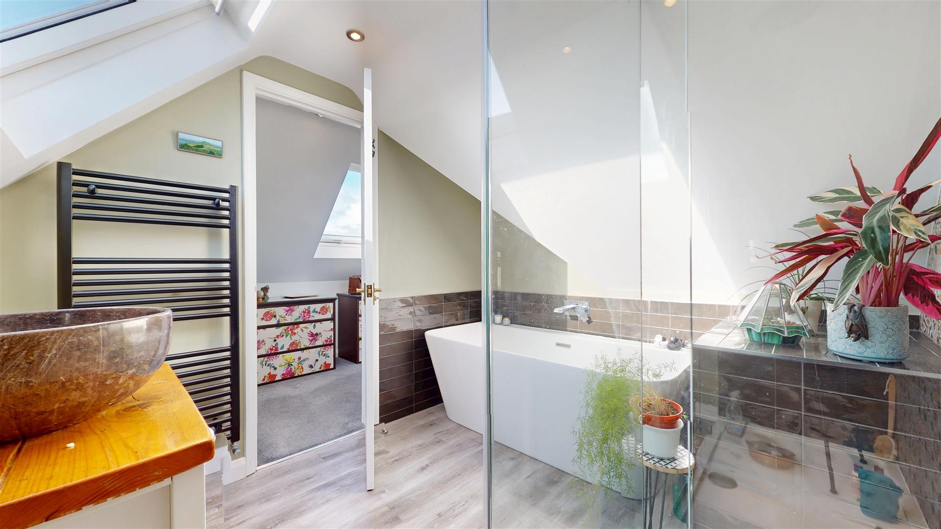- Converted loft principal bedroom suite with an en-suite bathroom with separate shower