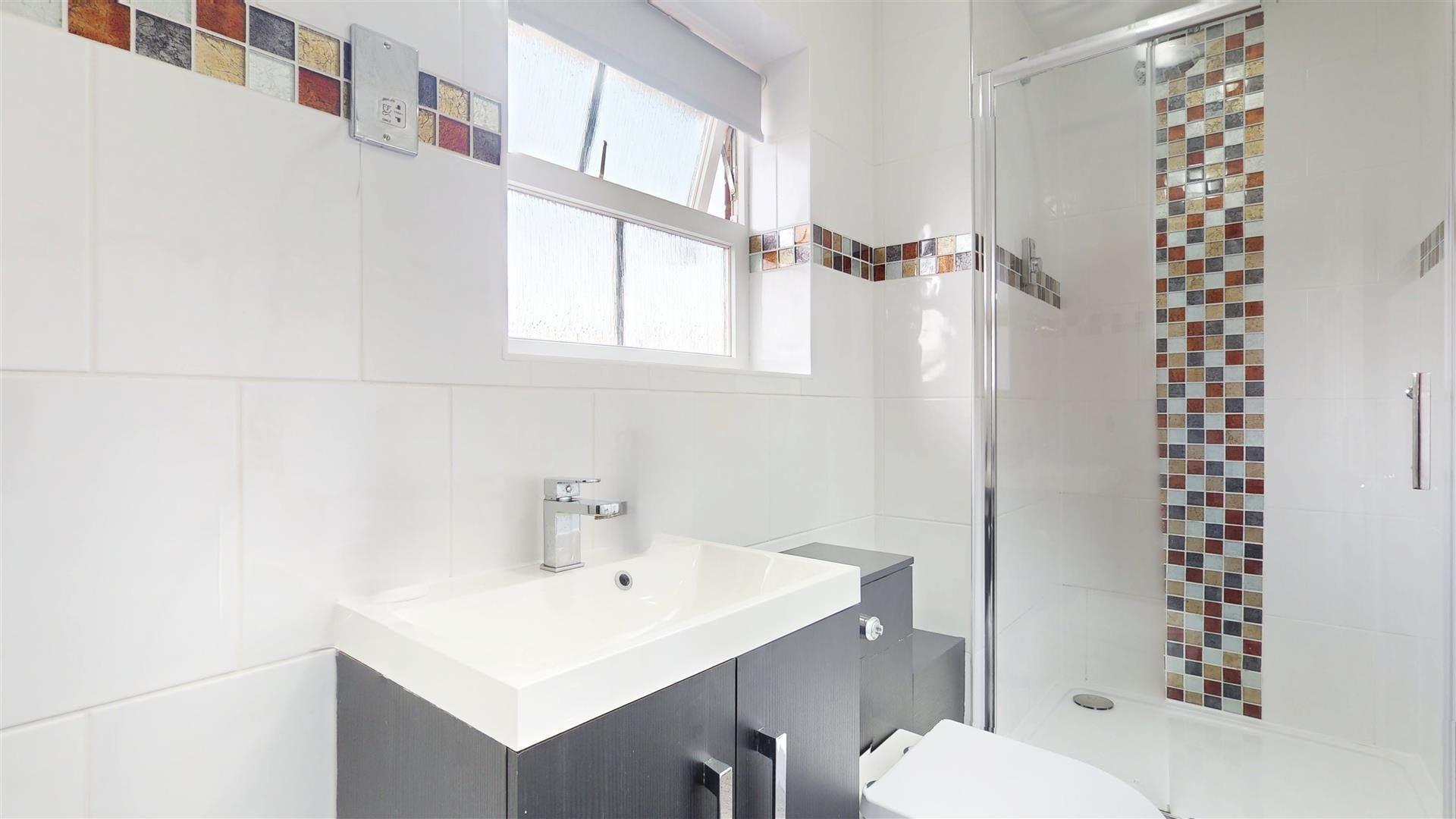 Double glazed skylight to the side. Four piece suite with bath. Walk-in double tiled shower cubicle with a wall mounted shower. Low level WC. Wash hand basin with mixer tap and splash back tile. Heated chrome towel rail.