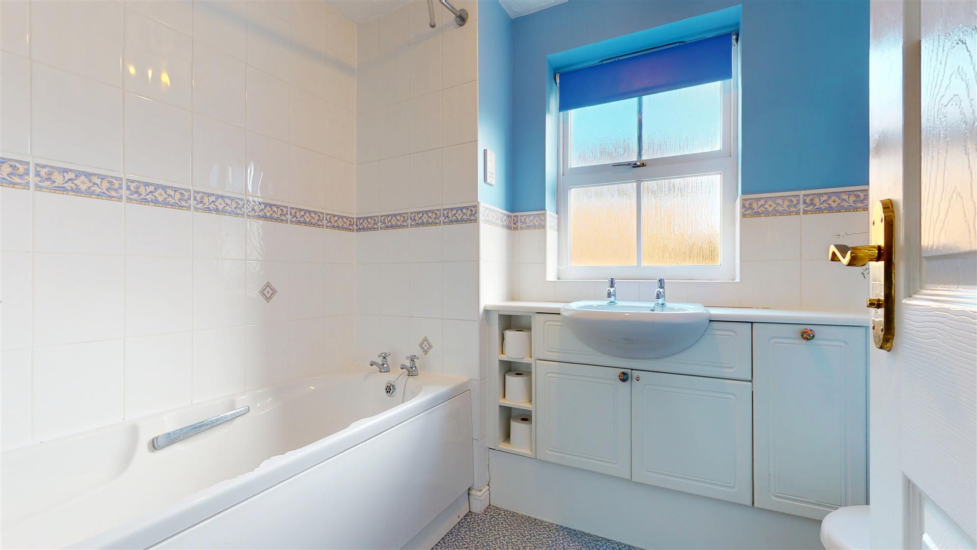 Frosted double glazed window to front aspect. Three piece suite comprising panelled bath with shower, low level wc and wash hand basin in vanity unit. Radiator. Tiled splash backs.