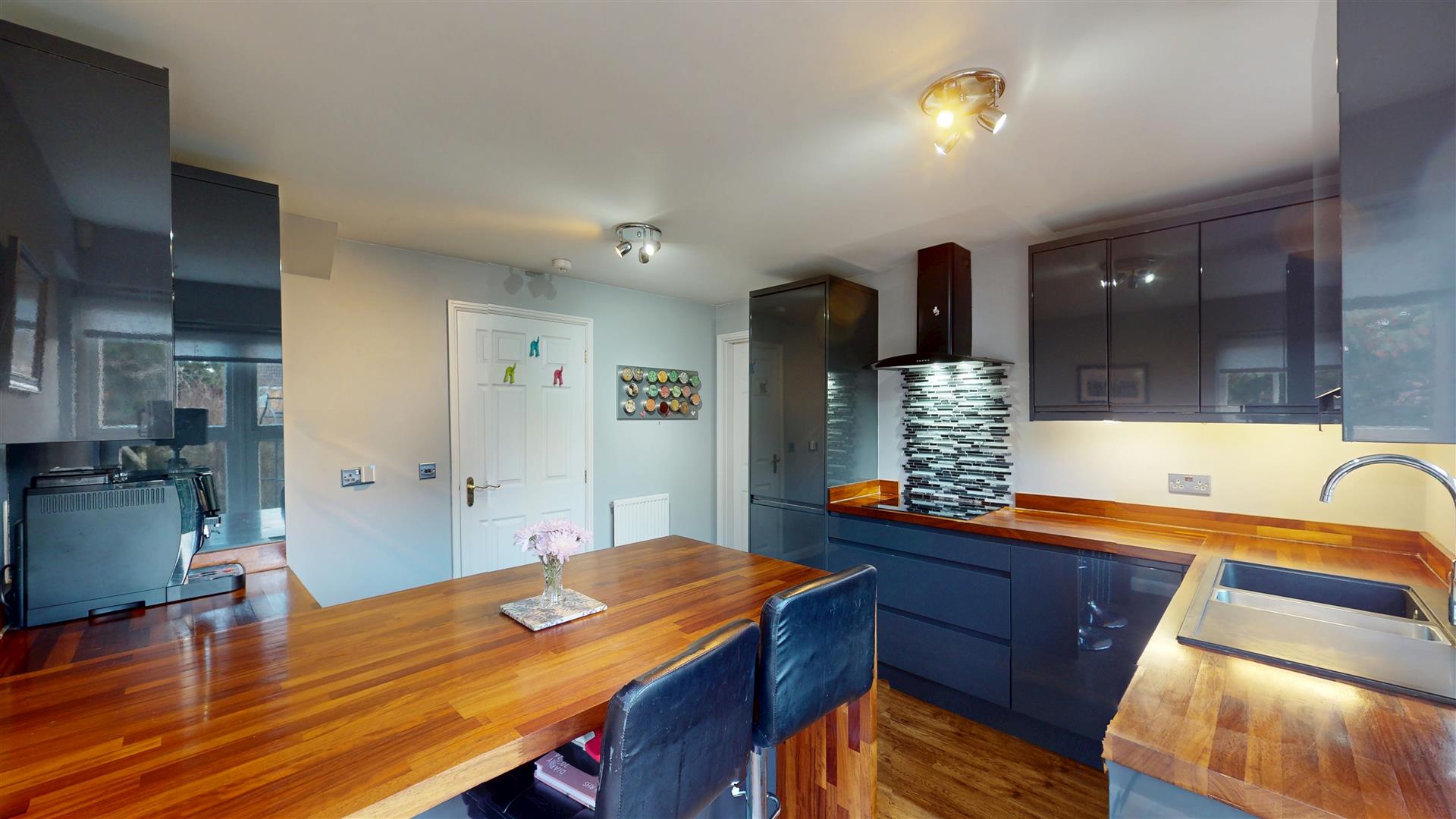 Twin double glazed window to rear aspect. Double glazed window to side aspect. Fitted with soft close wall and base units with wooden-work surfaces incorporating one and a half sink with mixer tap and cutlery drainer. Built in double oven and warming drawer. Fitted hob with extractor fan over. Tiled splash back to hob. Built-in microwave Built in larder fridge, built in under counter freezer, built in dishwasher. Radiator. Under unit lighting. Leading to Utility room. Skimmed ceiling.