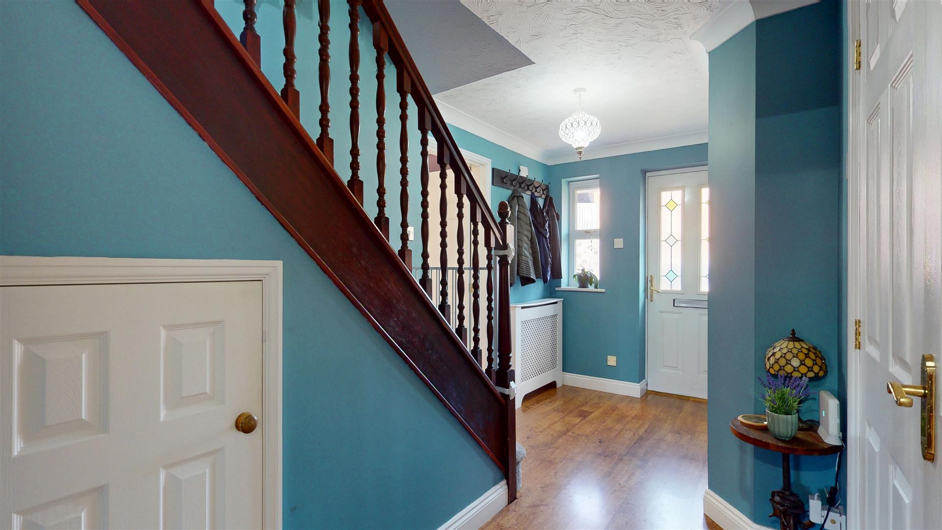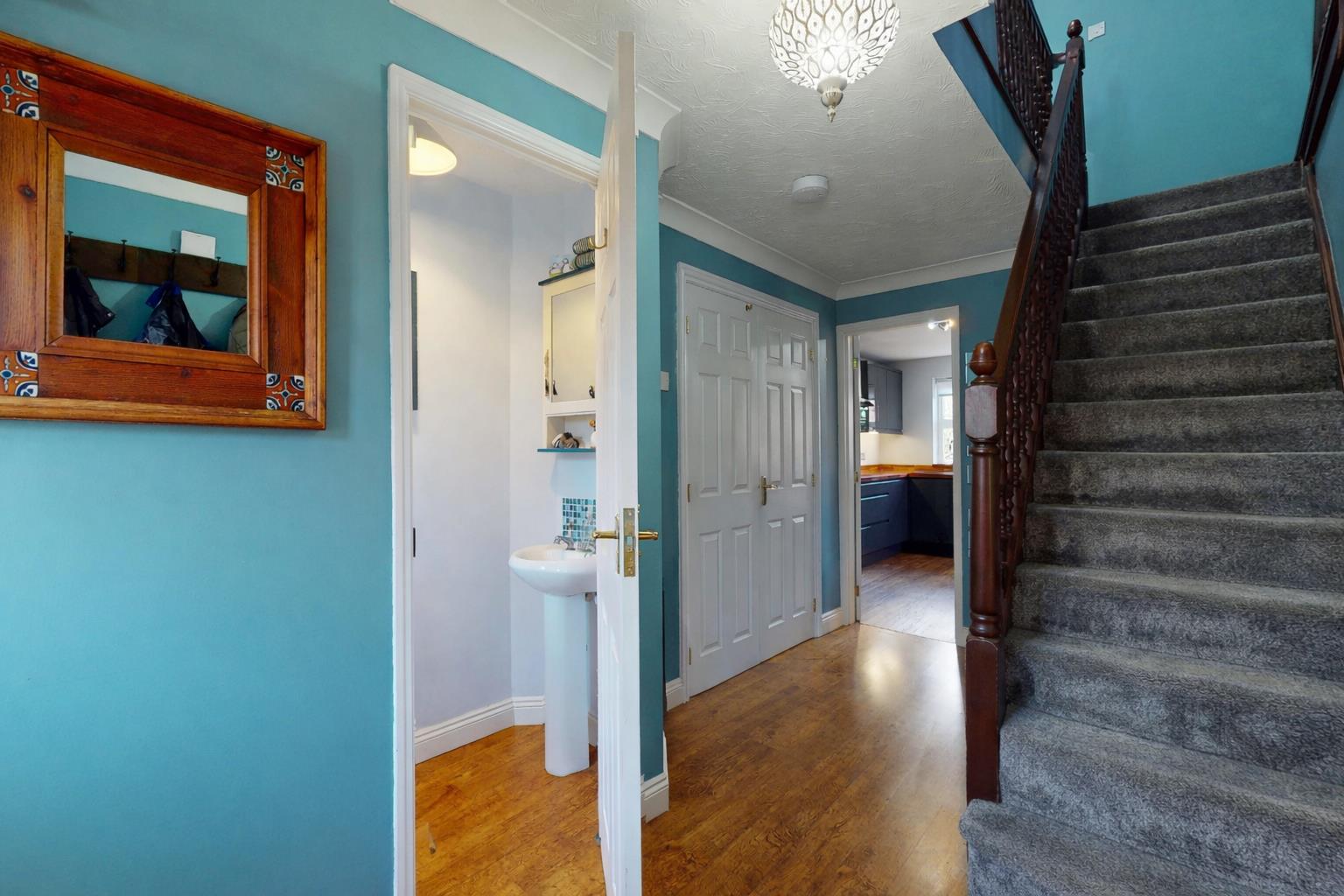 Entrance door. Radiator. Double glazed window to front aspect. Wood effect flooring. Stairs to first floor. French doors to dining room. Door to living room, kitchen/breakfast room and cloakroom.