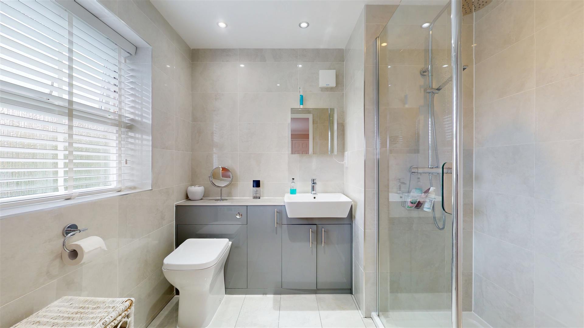 Three piece suite comprising double tiled shower cubicle. low level wc and wash hand basin in vanity surround. Tiled walls and flooring. Shaver point Extractor. Skimmed ceiling. Inset lighting. Heated towel rail. Frosted double glazed window to rear.