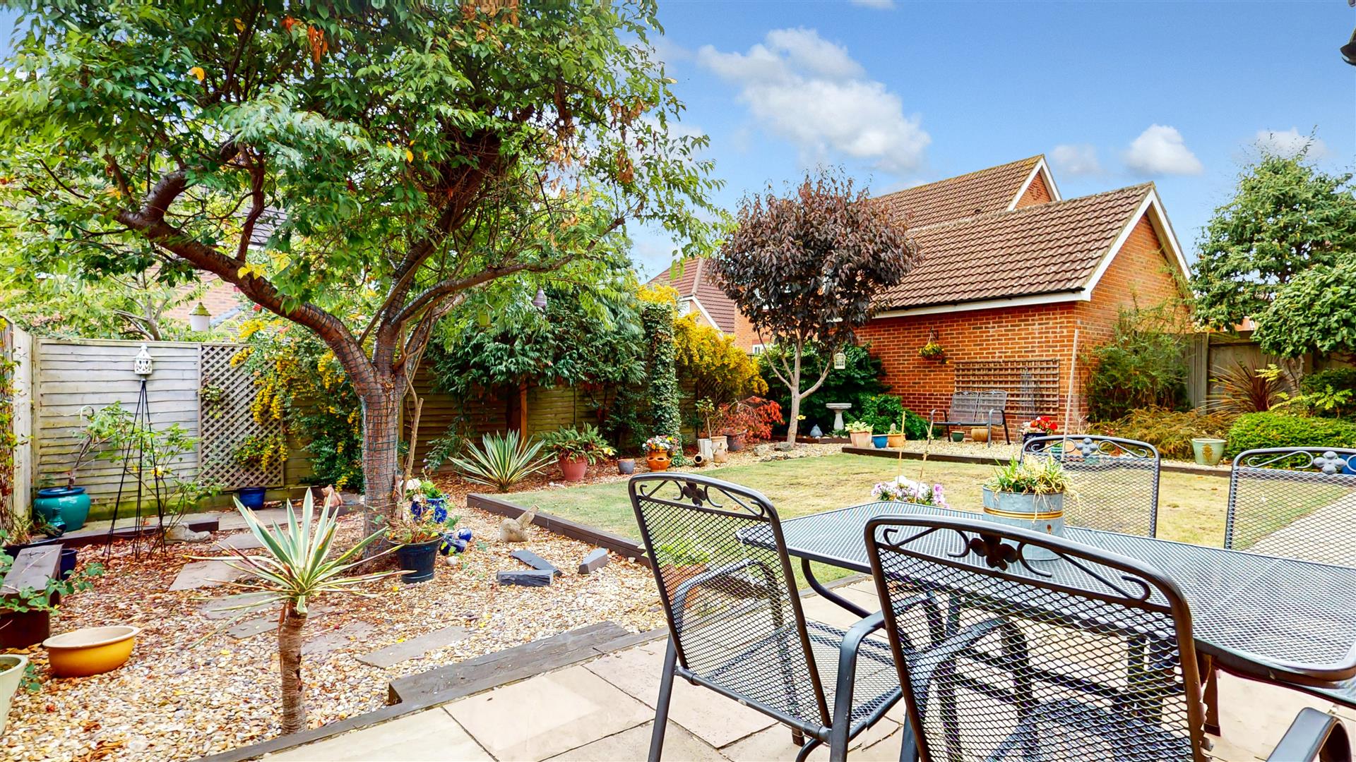 Enclosed and secluded rear garden, mainly laid to lawn with shingle border and wooden fence surround. Mature tree flower and shrub borders. Gated side access. Outside power, light and tap. Service door to double garage.