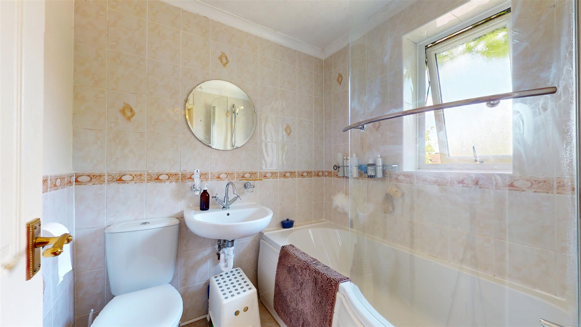 Frosted double gla zed window to front aspect. Three piece suite comprising panelled bath with shower above and screen, low level wc and wash hand basin. Heated towel rail. Tiled splash backs.