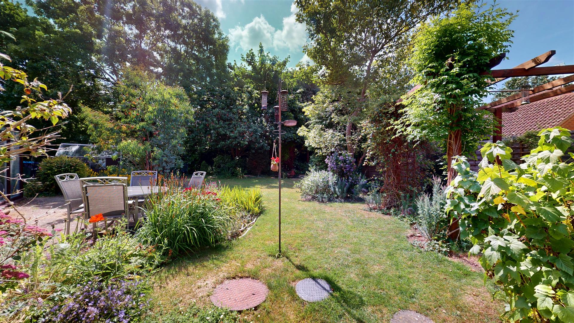 A generous secluded enclosed rear garden, laid mainly to lawn well stocked with mature tree flower and shrub borders. Patio ara. Gated access to front.