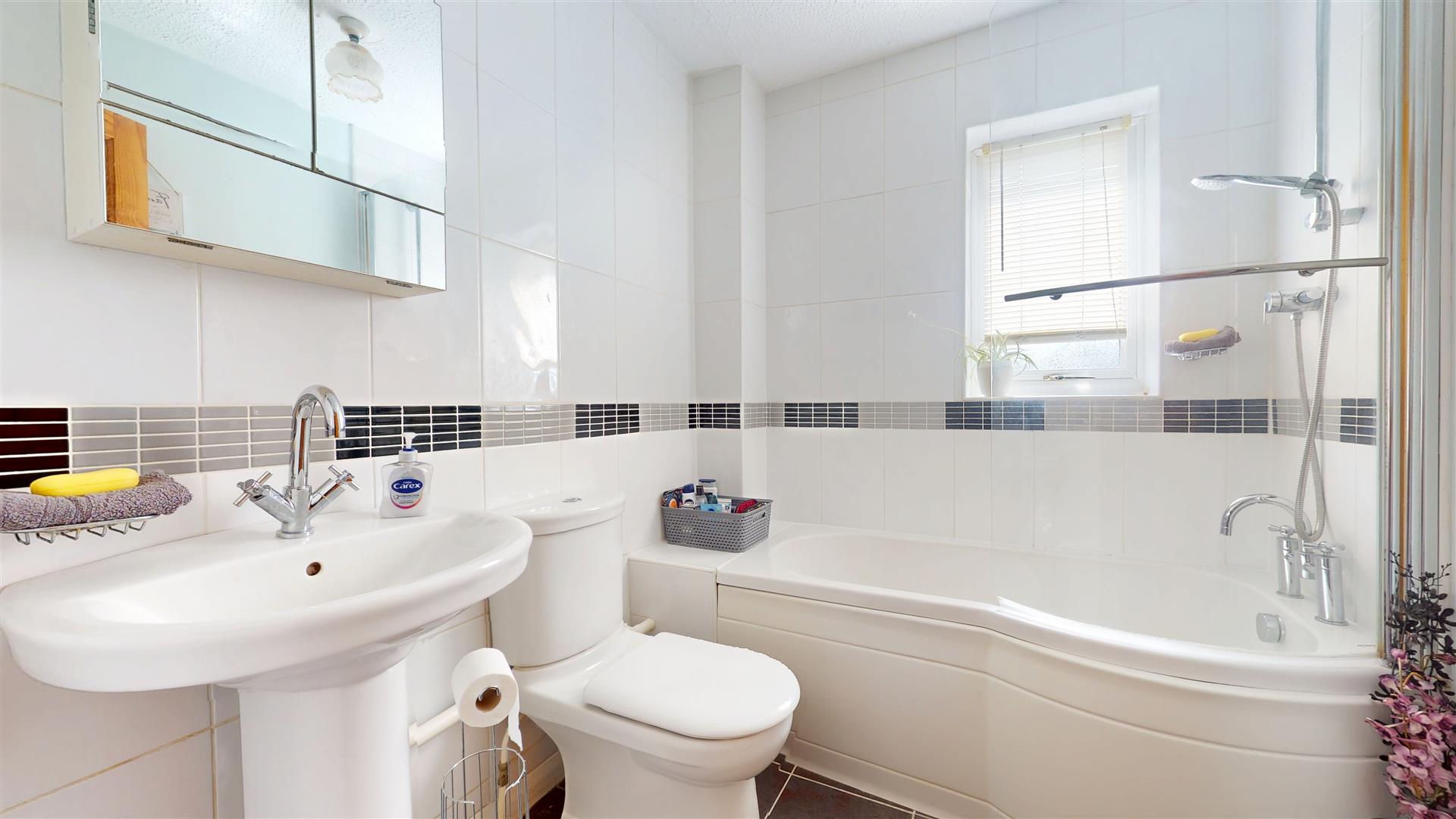 Frosted double glazed window to the rear. P shaped bath with mixer tap and mains shower and fitted glass shower screen. Low level wc, wash hand basin with mixer tap, heated towel rail. Tiled flooring. Wall mounted medicine cabinet.