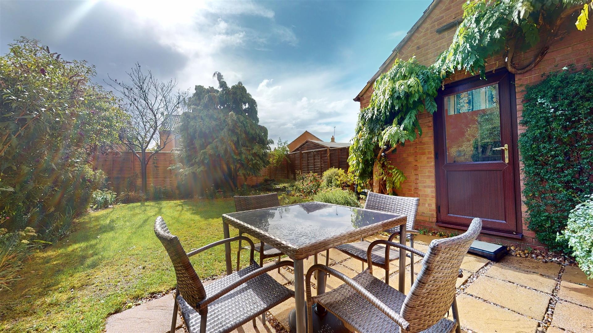 Mainly laid to lawn. Patio area. Selection of mature flower beds and borders. Outside tap.