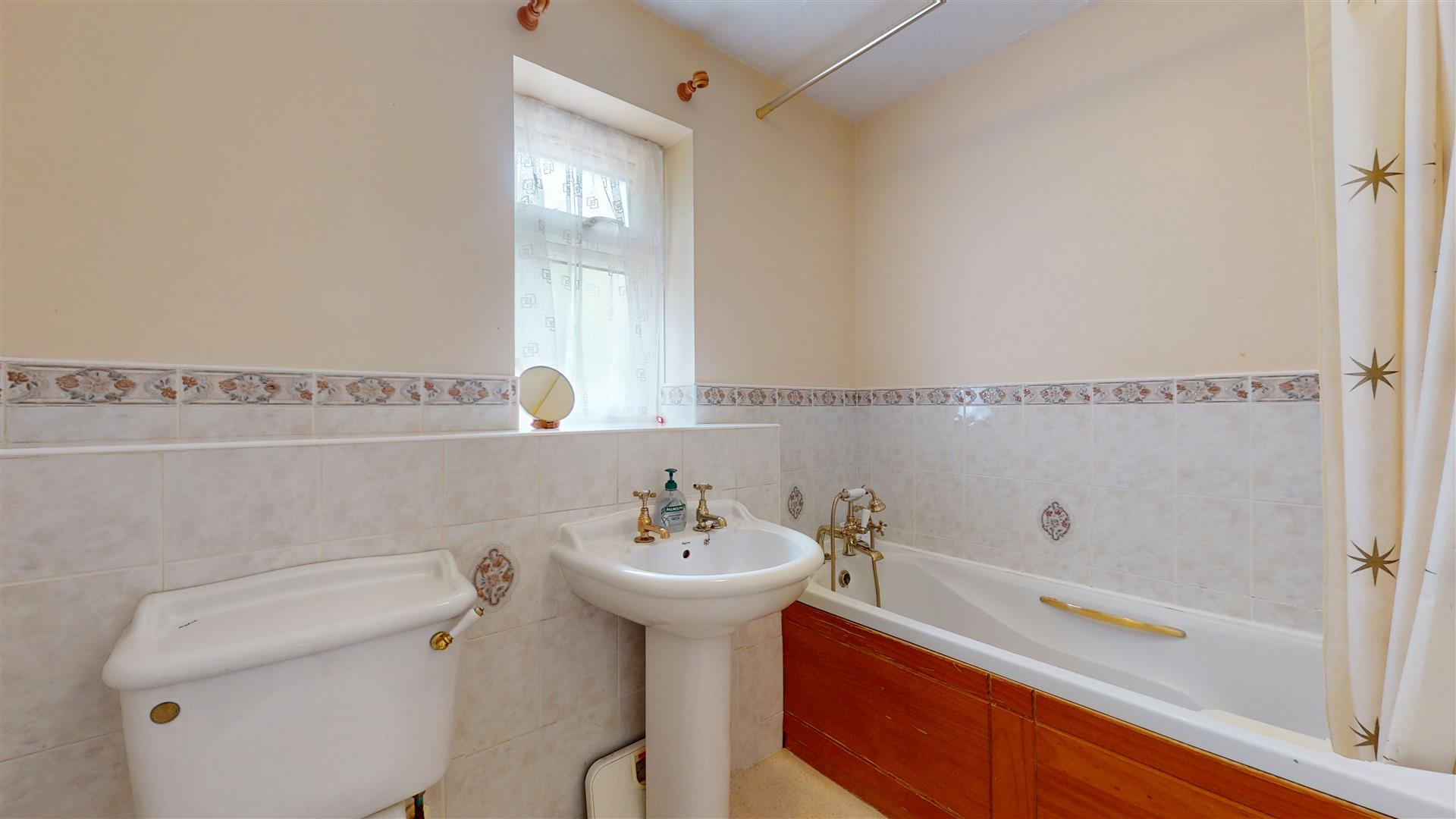 Three piece suite comprising panelled bath with shower attachment low level wc and wash hand basin. Radiator. Frosted double glazed window to rear.