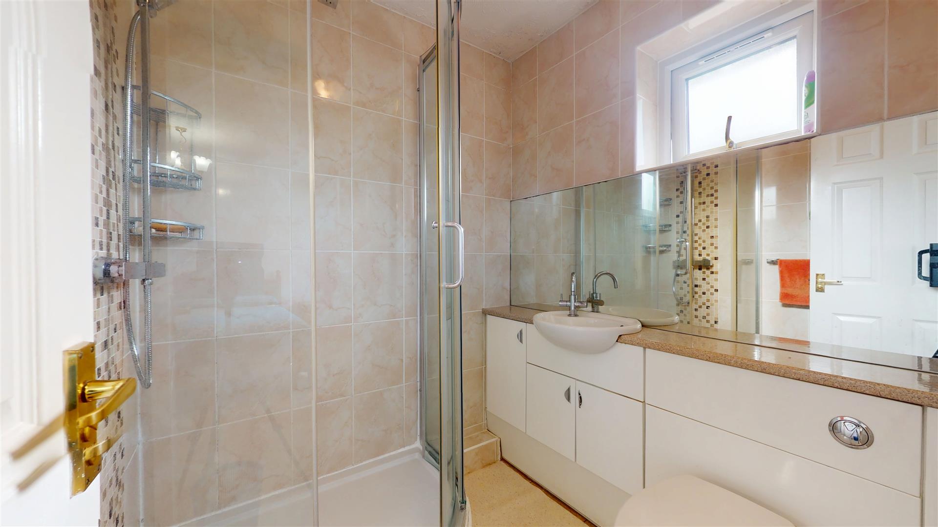 Three piece suite comprising tiled shower cubicle with wall mounted shower, low level wc and wash hand basin in vanity surround. Frosted double glazed window to front. Extractor