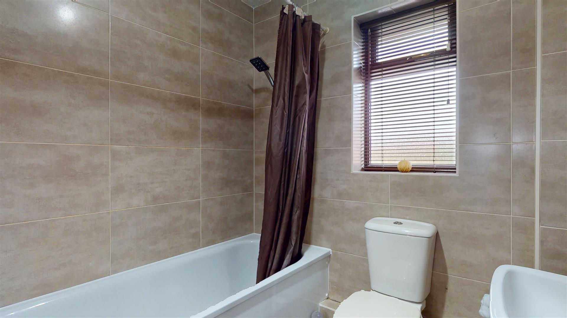 Three piece re-fitted suite comprising panelled bath with mixer tap and shower attachment, low level wc and wash hand basin. Tiled walls. Frosted double glazed window to front. Extractor. Towel rail.