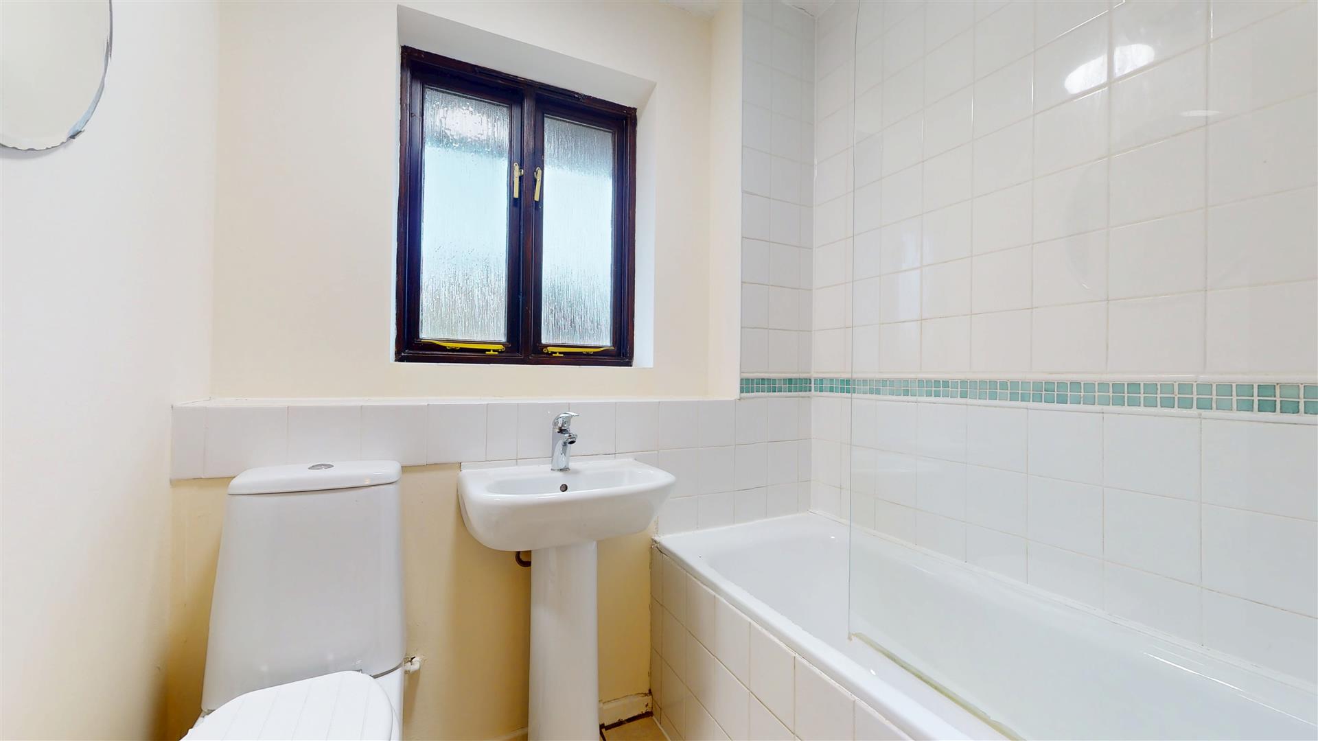 Double glazed obscure window to rear. Three piece suite comprising bath with mixer tap and shower over with screen, wash hand basin and close coupled wc. Extractor fan. Electric heater.