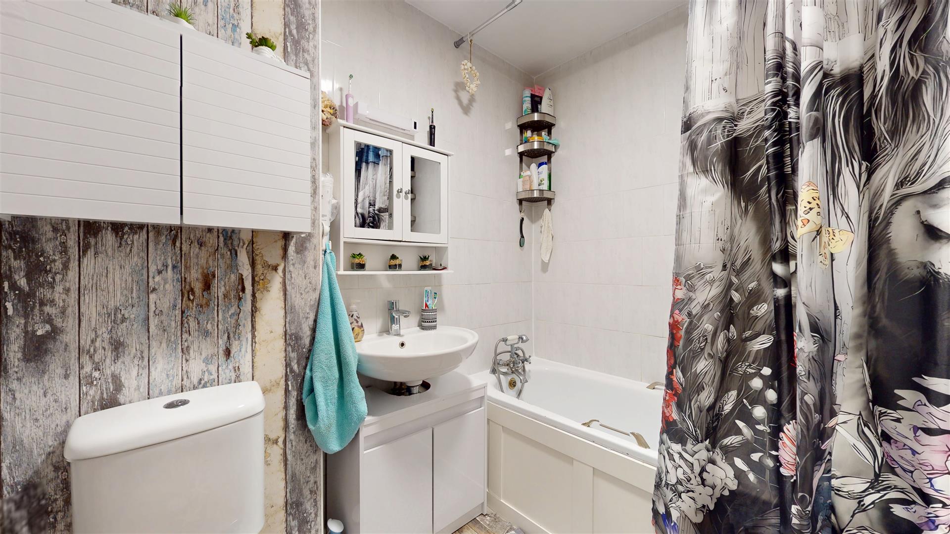 Refitted family bathroom. Low level wc, wash hand basin. Panelled bath with mixer tap and shower over. Heated towel radiator.