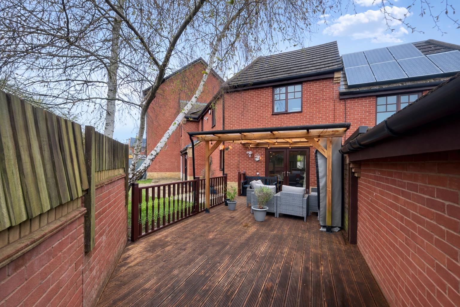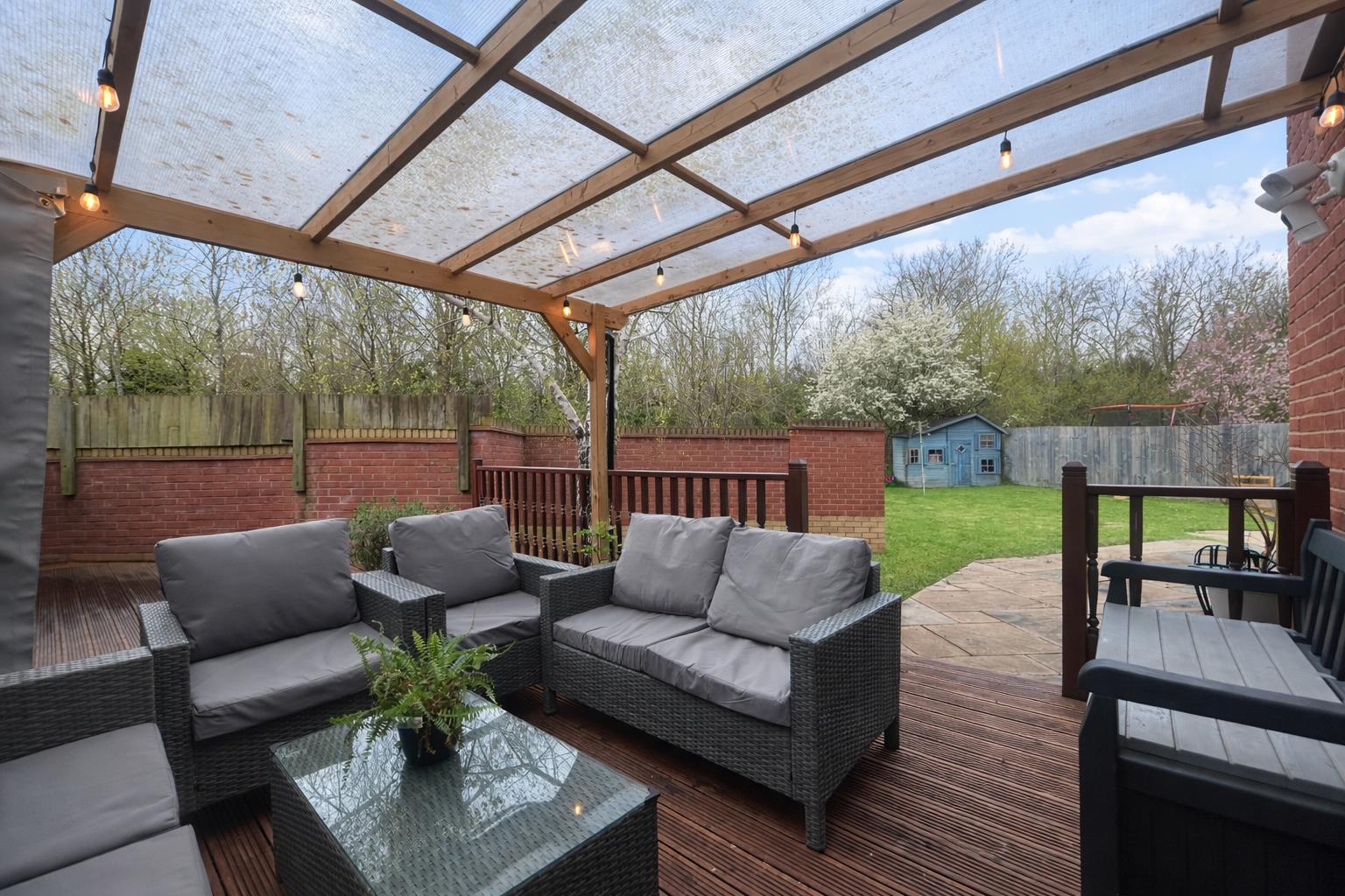 Patio area and mainly laid to lawn with a decking area to the side with a fitted pergola. Shed.