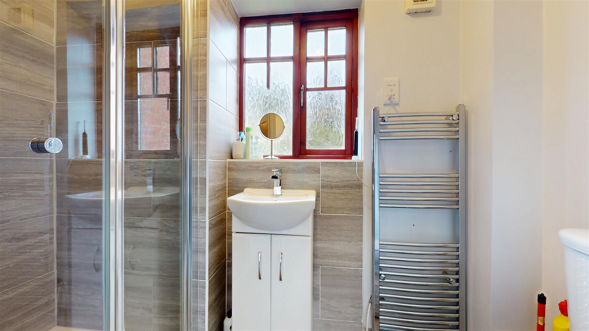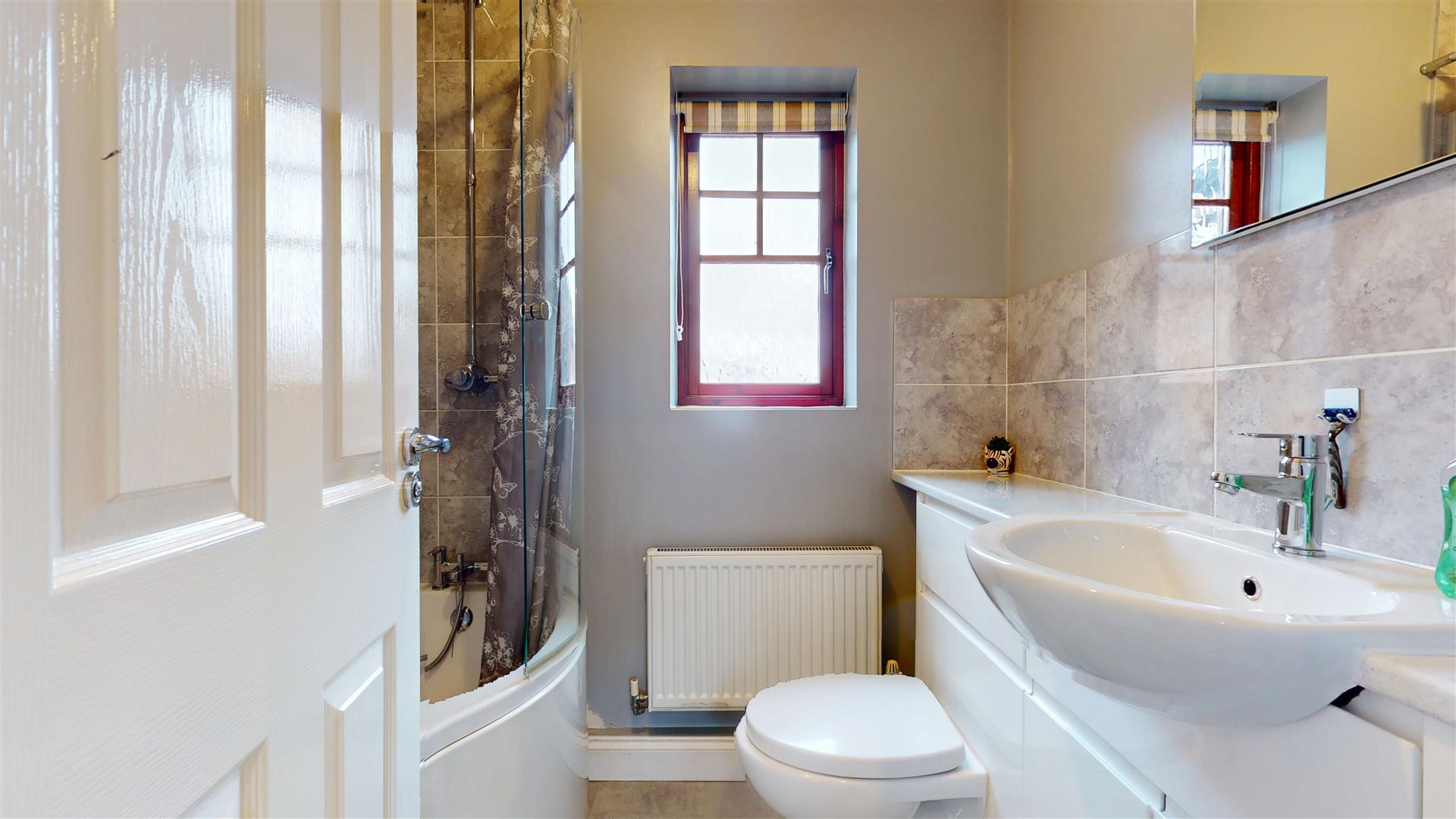 Three piece suite comprising tiled shower cubicle with shower, low level wc and wash hand basin. Splash back tiling. Radiator. Extractor. Frosted double glazed window to rear. Skimmed ceiling.