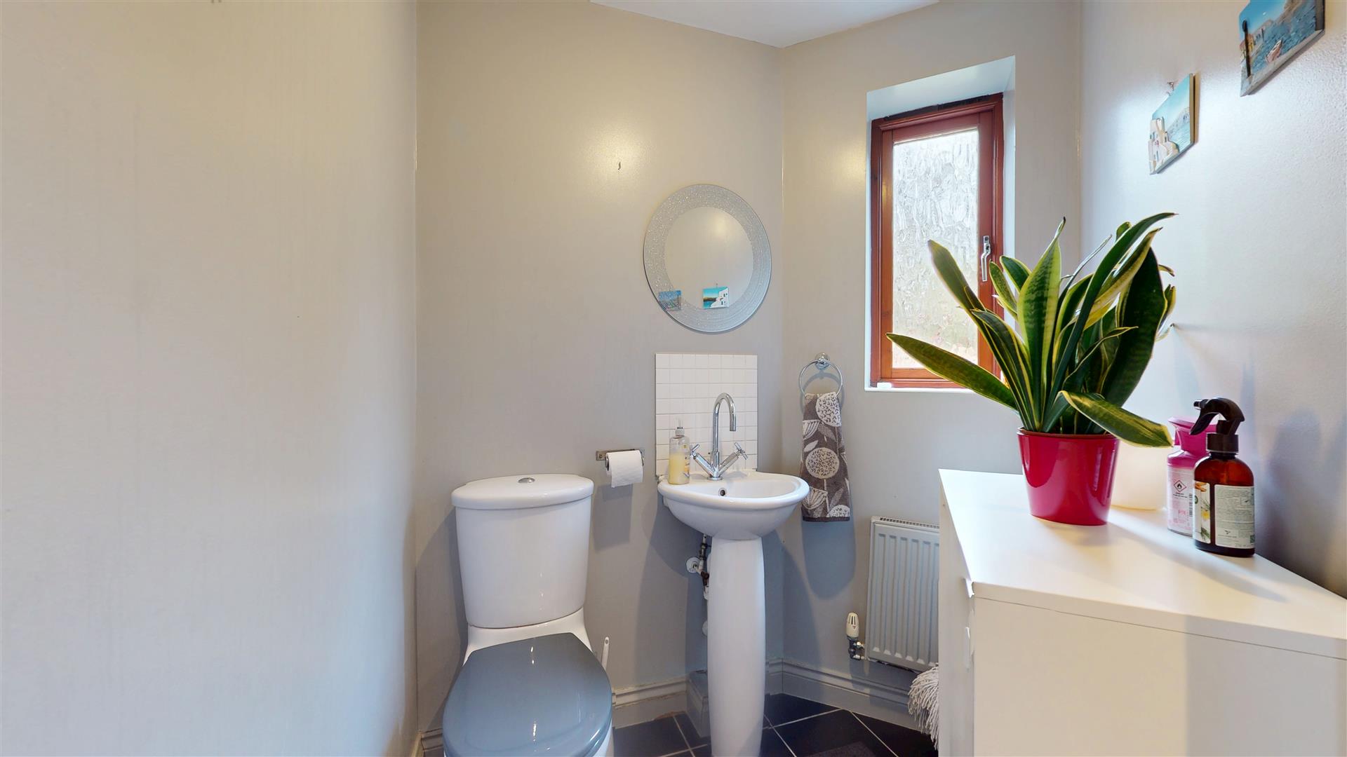 Two piece suite comprising low level wc and wash hand basin. Tiled flooring. Radiator. Frosted double glazed window to rear. Skimmed ceiling.