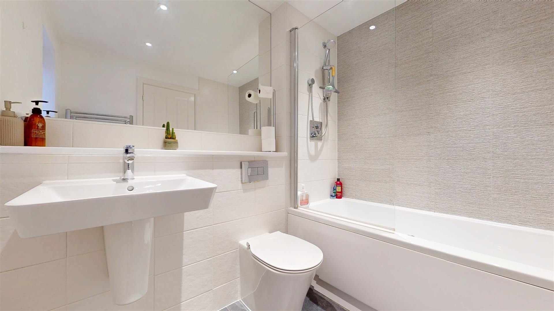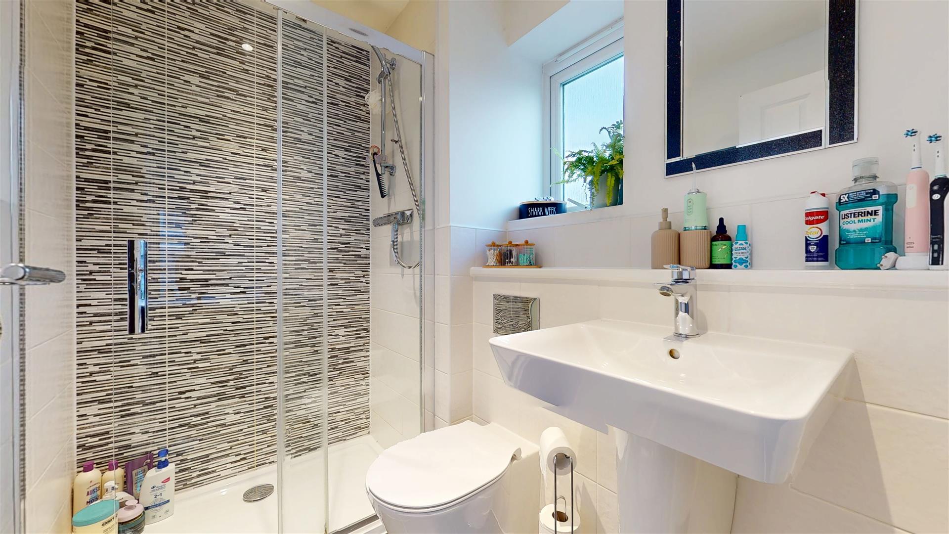 Three piece suite comprising shower cubicle, low level wc and wash hand basin. Heated towel rail. Tiled flooring. Part tiled walls. Double glazed sky light to rear. Skimmed ceiling. Inset lighting. Extractor.