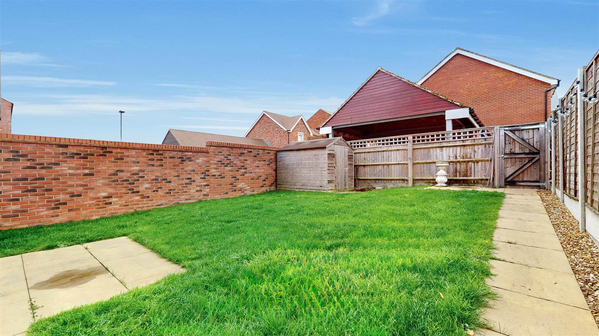 Enclosed and laid mainly to lawn with patio area, wooden fence and brick surround. Gated access. Car port and further parking.