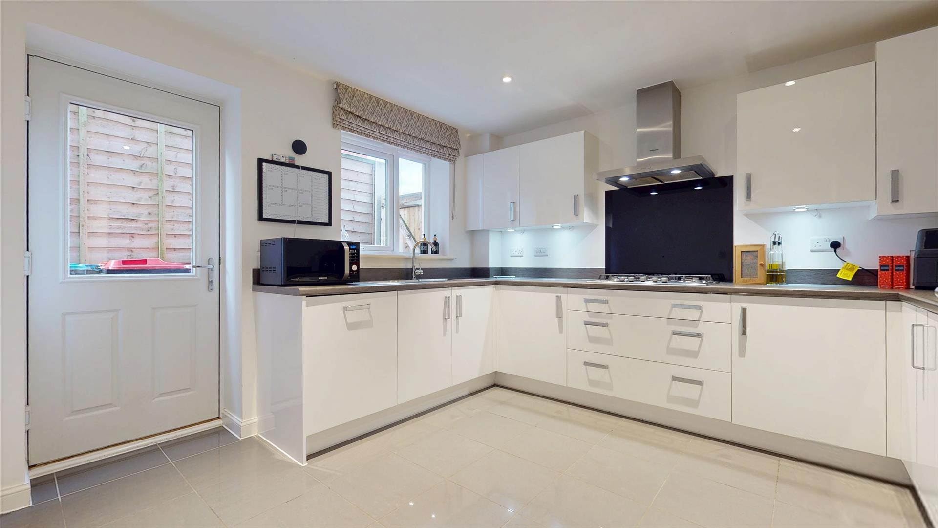 Fitted with a range of wall and base units with worksurfaces incorporating one and half bowl sink drainer with mixer tap. Built in double oven, five ring gas hob and extractor hood. Built in dishwasher and fridge freezer. Tiled flooring. Double glazed window to rear and double glazed door to rear. Radiator. Skimmed ceiling with inset lighting. Under unit lighting.