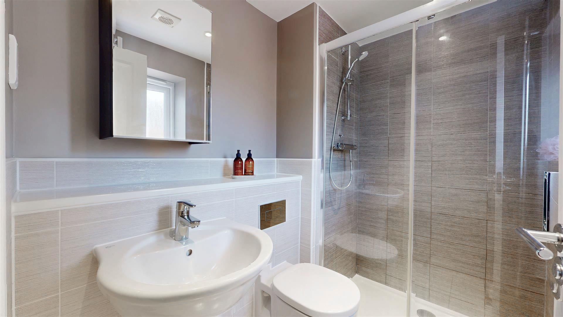Three piece suite comprising double tiled shower cubicle, low level wc and wash hand basin. Heated towel rail. Part tiled walls. Skimmed ceiling. Extractor. Tiled flooring.