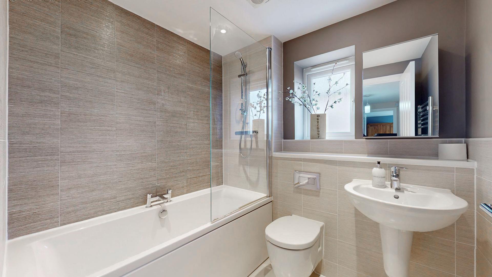 Three piece suite comprising panelled bath with shower over, low level wc and wash hand basin. Part tiled walls. Tiled flooring Heated towel rail. Skimmed ceiling. Extractor.