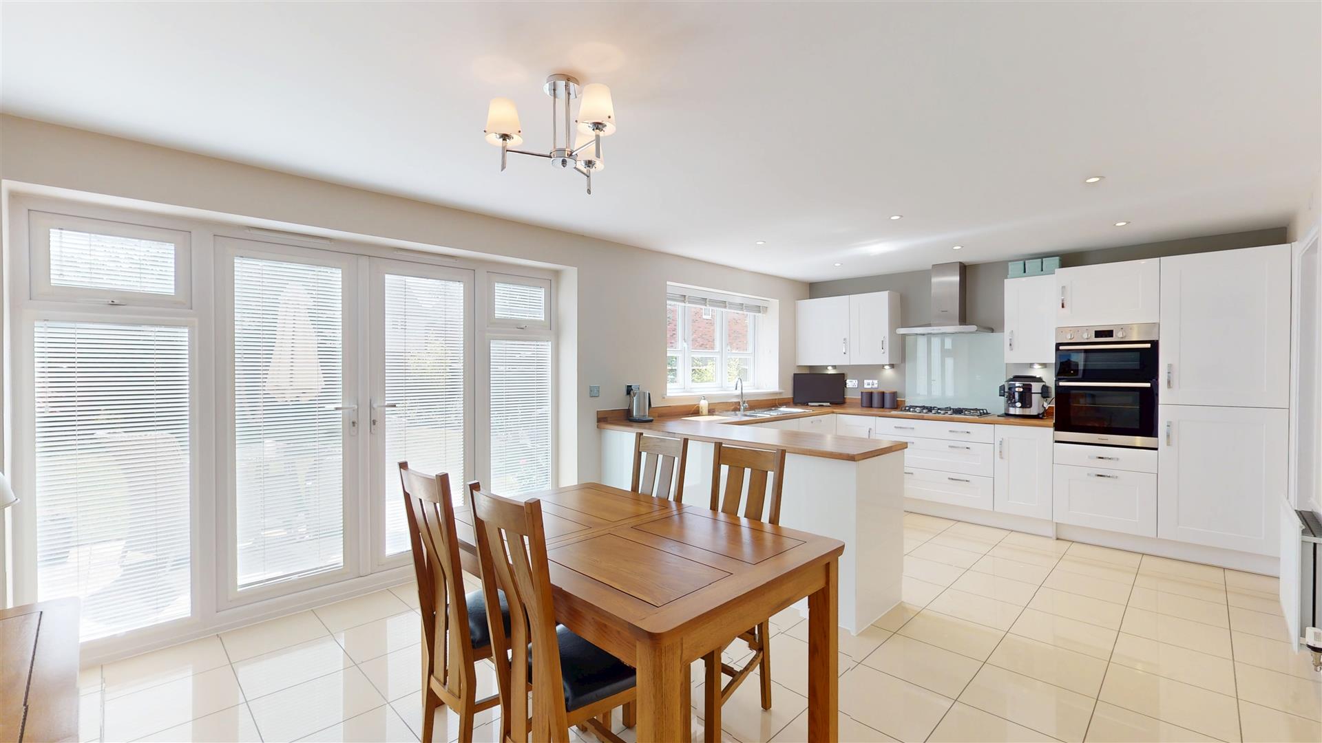 Fitted with a range of wall and base units with worksufaces incorporating one and half bowl sink drainer. Built in double oven, five ring gas hob and extractor hood. Built in dishwasher and fridge freezer. Breakfast bar. Under unit lighting. Double glazed French doors and window to rear. Two double panelled radiators. Skimmed ceiling with inset lighting. Tiled flooring . Door to utility room.