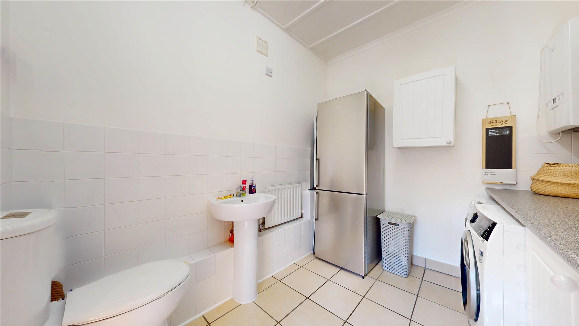 Fitted with a range of wall and base units. Roll top work surface. Plumbing for washing machine, space for tumble dryer. Low level wc, wash hand basin with stainless steel mixer tap. Loft access.