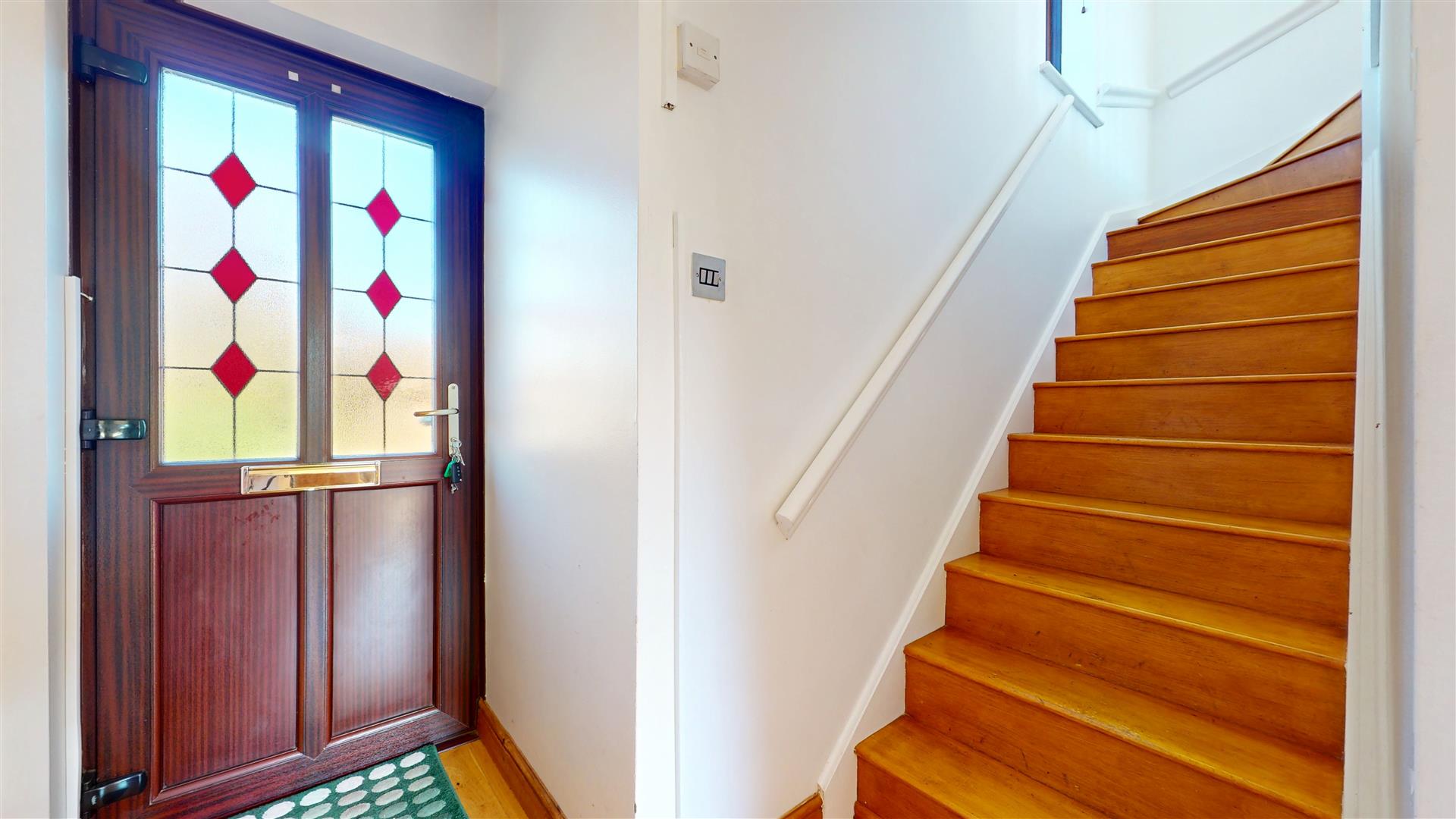 Entrance through front door into entrance hall. Stairs leading to first floor and door leading to living room.