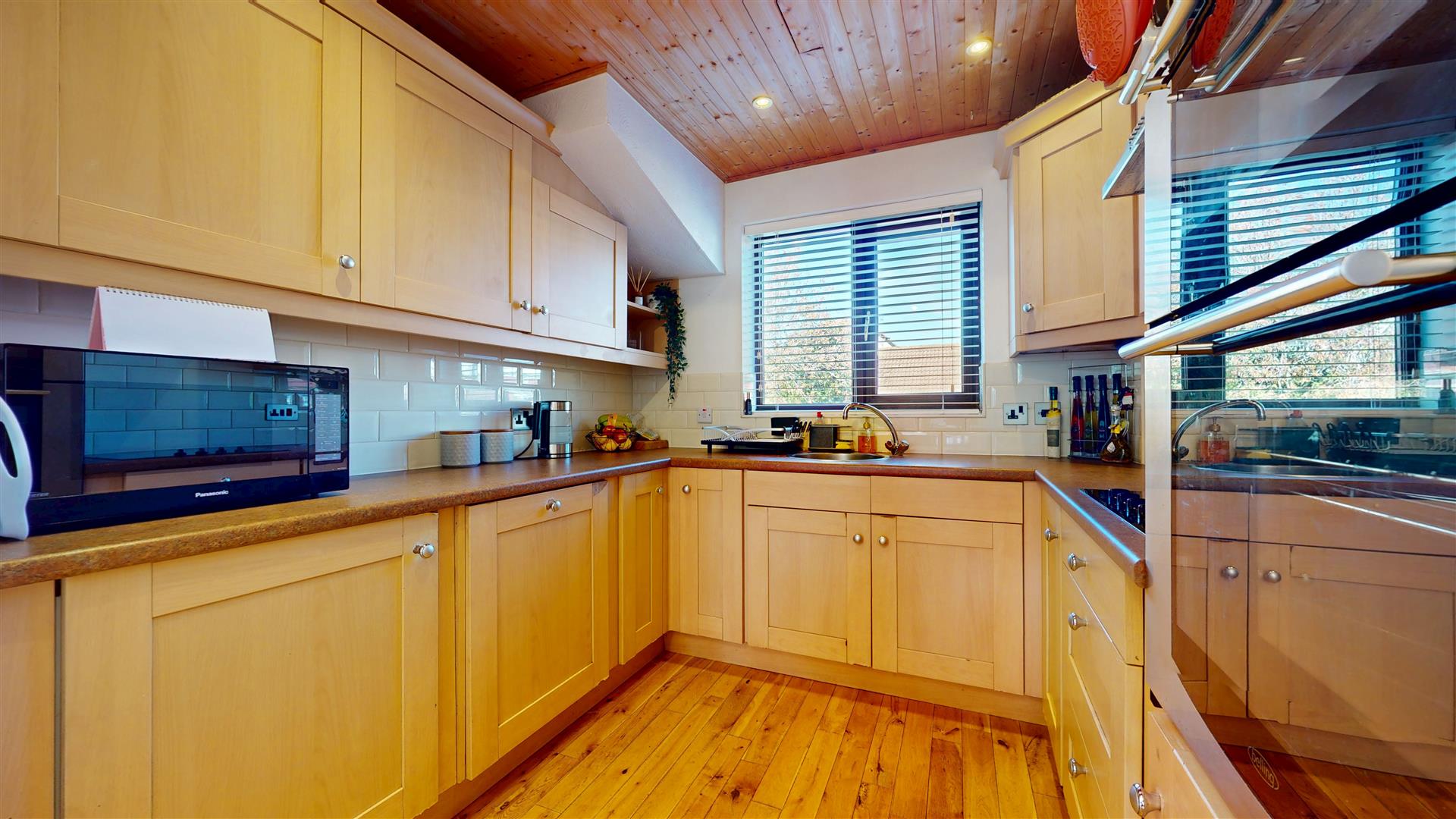 Fitted with a range of wall and base units. Roll top work surfaces incorporating a stainless steel with stainless steel mixer tap. Stainless steel double oven, four ring hob and stainless steel extractor hood. Built in dish washer, built in fridge, double glazed window to the front, splash back tiles.