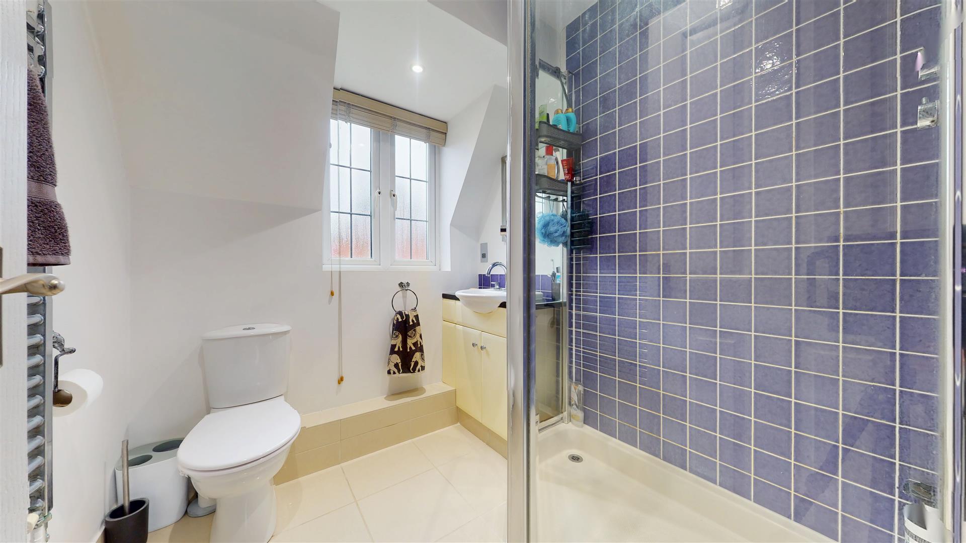 Double glazed obscure window to rear. Double shower cubicle with wall mounted shower, wash hand basin in vanity surround and close coupled wc. Shaver point. Heated towel rail. Tiled flooring.