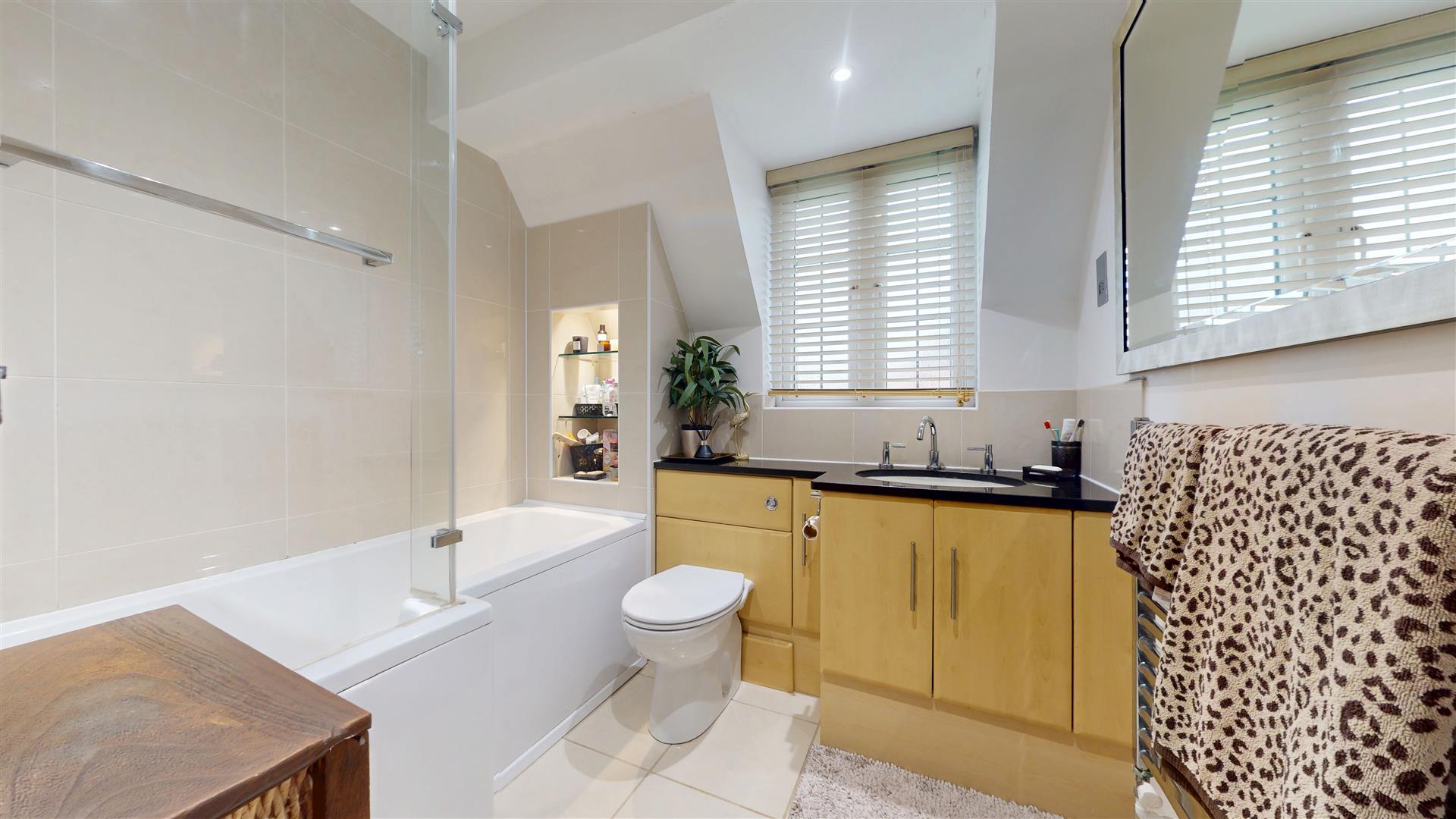 Double glazed obscure window to rear. 'P' shaped bath with mixer tap and shower over with glass screen, wash hand basin in vanity surround and close coupled wc. Electric shaver point. Inset shelving with light. Heated towel rail. Tiled flooring.