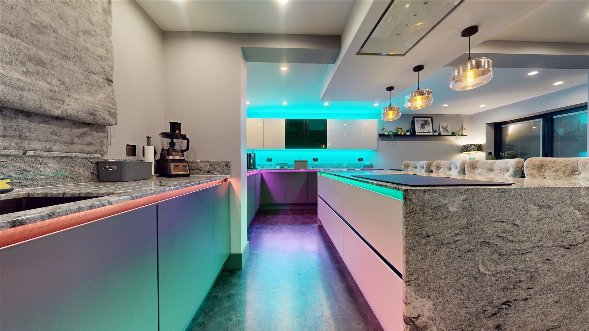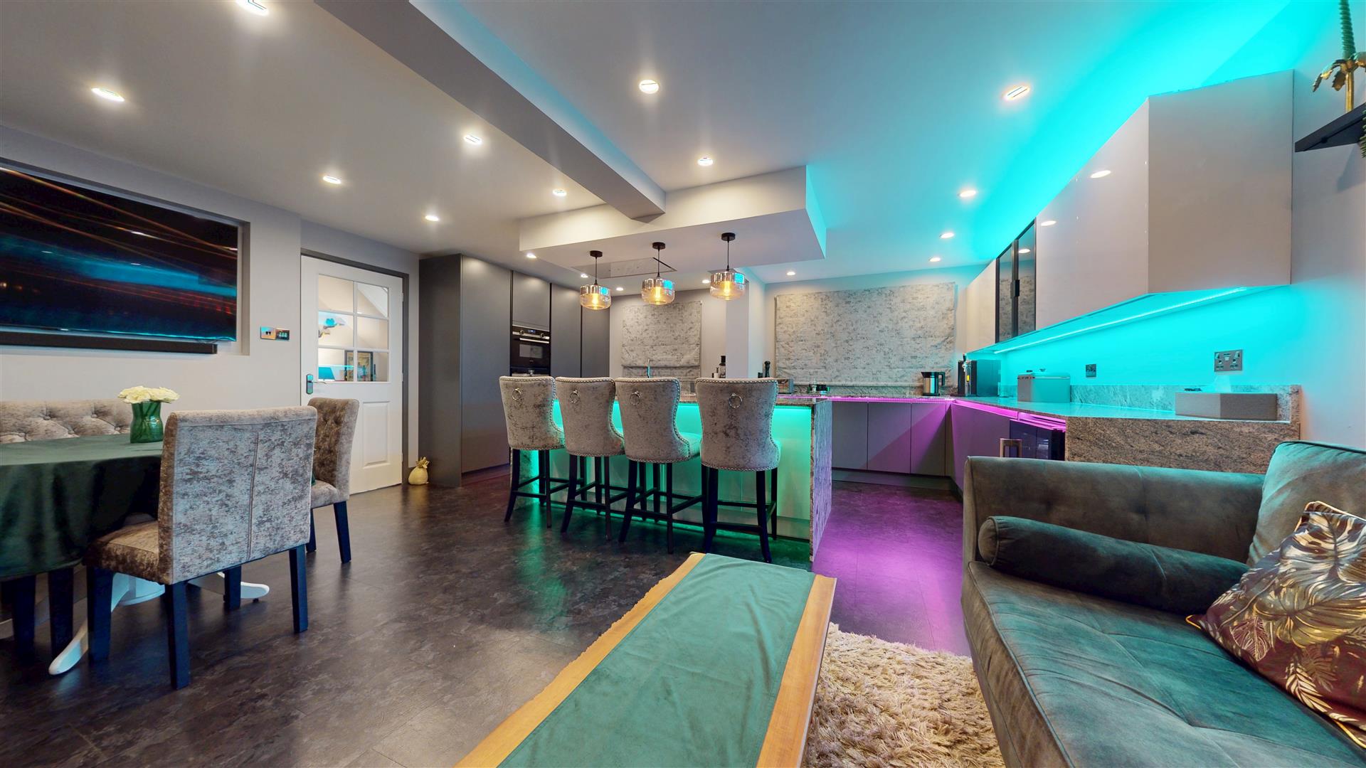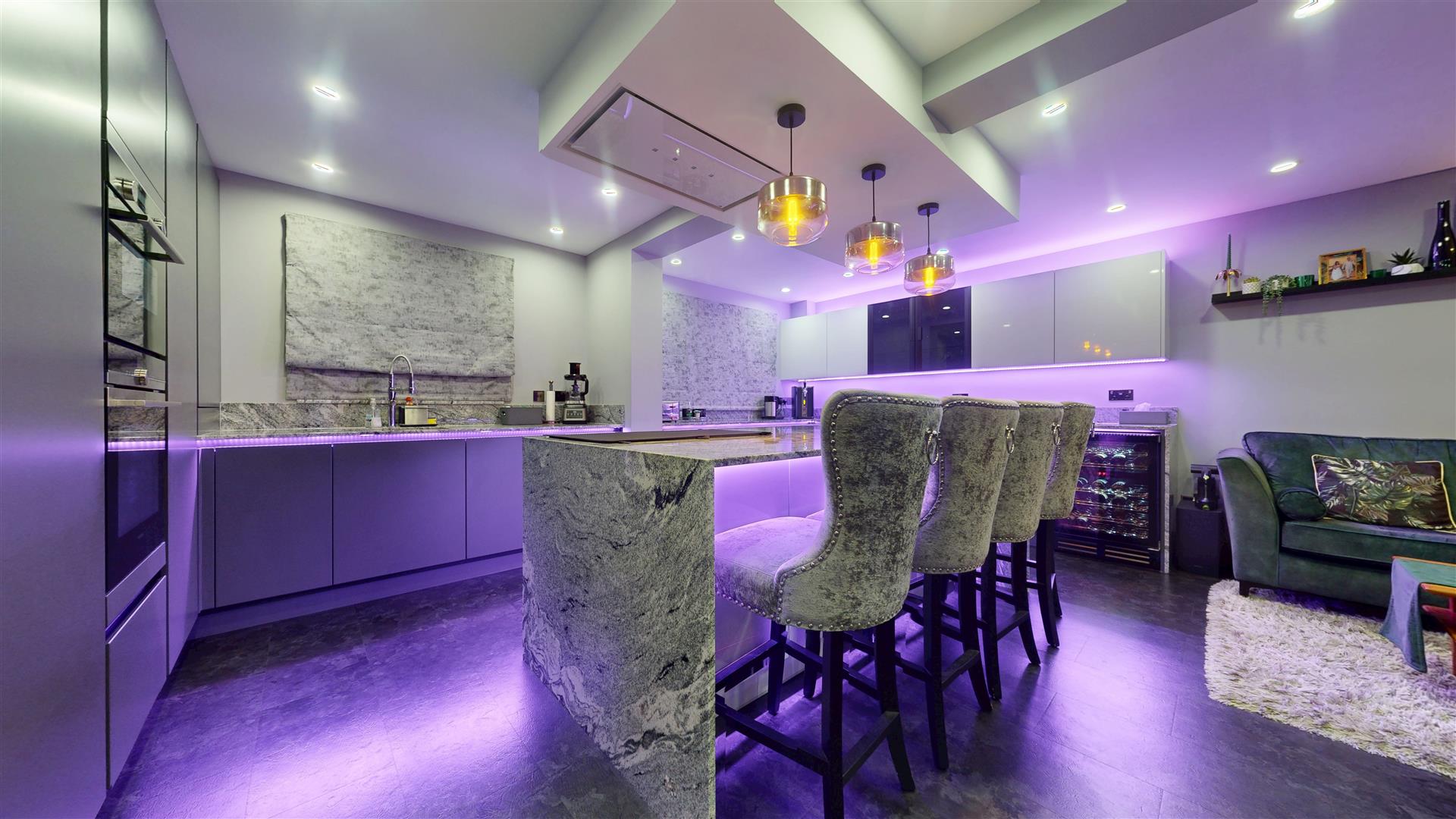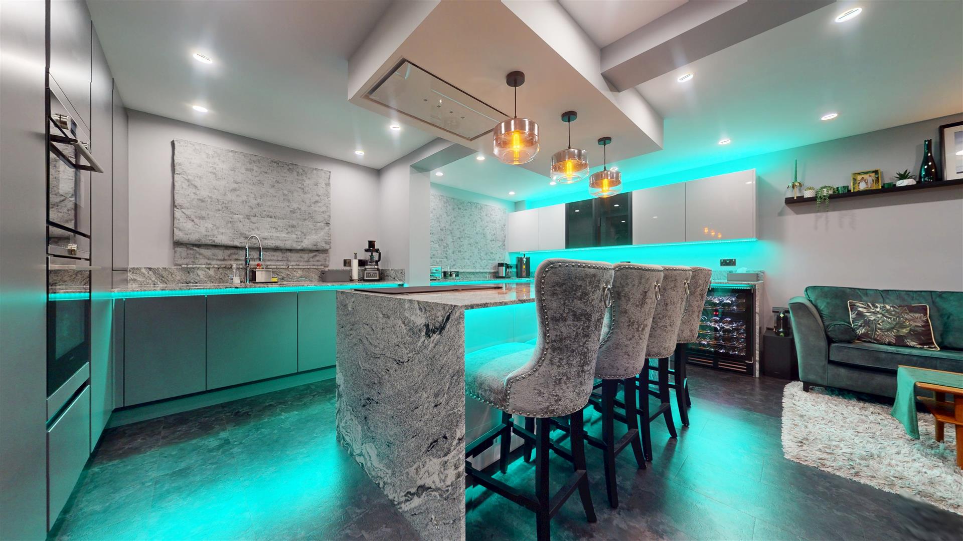 Two double glazed windows to front Two sets of bi folding doors to rear with inset blinds. Re-fitted with a range of contrasting colour wall and base units with Indian Granite worksurfaces incorporating sink unit. LED lighting. Central breakfast bar island with base units inset LED lighting and Granite worksurface. Induction hob with ceiling mounted extractor fan and hanging lights. Integral dishwasher, washer dryer, full height fridge and full height freezer and wine cooler with additional integral under counter fridge. Electric oven, combi grill oven. LED lighting with cool white or warm options. Vertical radiator. Karndean flooring.