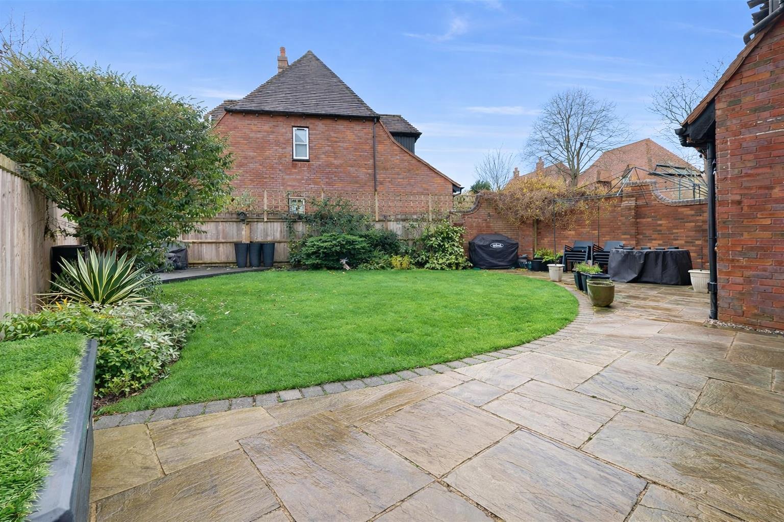 Rear width sandstone patio area Part walled. Laid to lawn and second patio area. Mature flower beds and borders. Outside tap and power. Gated access to front.