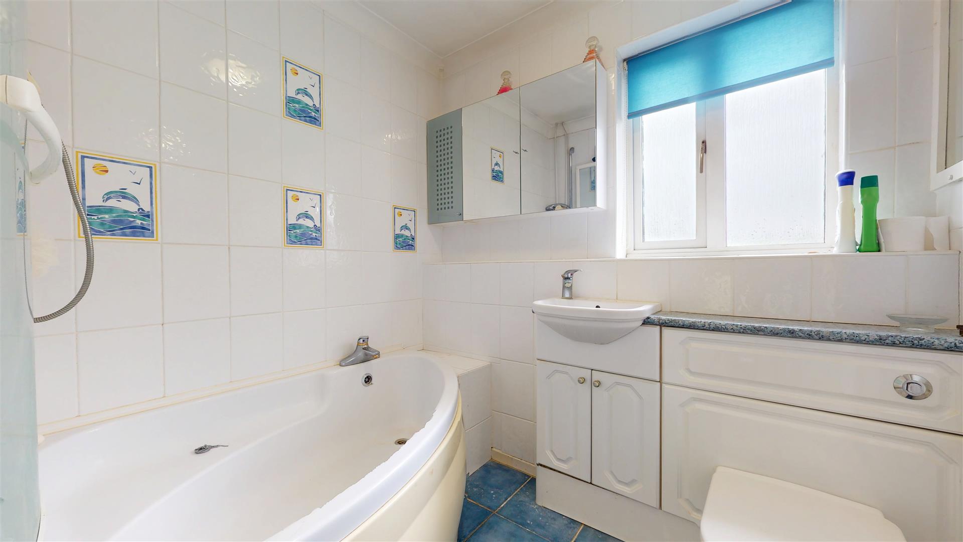 Double glazed obscure window to front. Three piece suite comprising corner bath with mains shower, wash hand basin in vanity surround and close coupled wc. Wall mounted cabinet. Radiator. Tiled walls and flooring