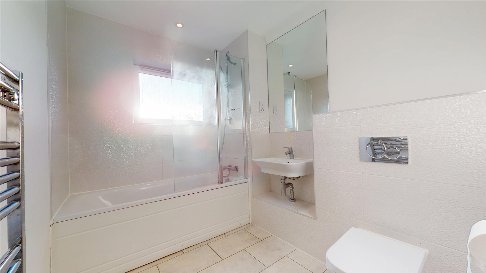 Double glazed obscure window to rear. Three piece suite comprising bath with shower over, wash hand basin and close coupled wc. Wall mounted mirror.